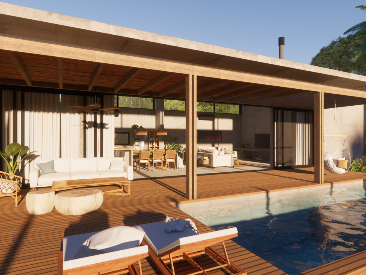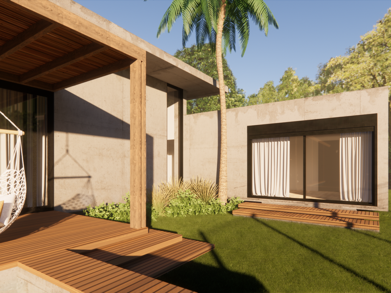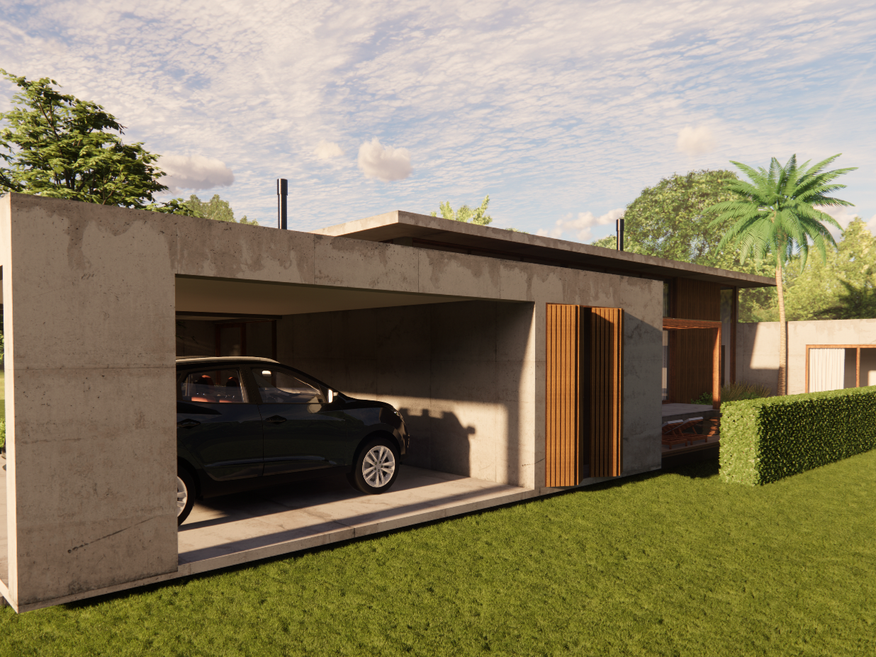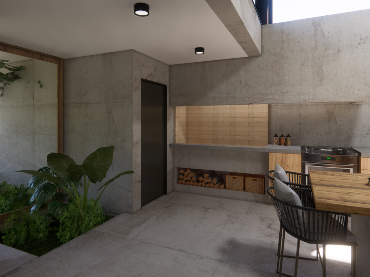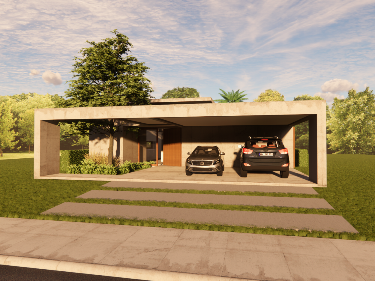 Projeto de uma residência térrea de alto padrão em uma área exclusiva da cidade. A casa, projetada inteiramente em concreto, é organizada em torno de um espaço externo central, o “coração da casa”. Esta área externa não só conecta os diferentes espaços internos, mas também proporciona uma atmosfera de relaxamento e convívio ao ar livre. Design moderno e elegante, aliado à durabilidade do concreto.