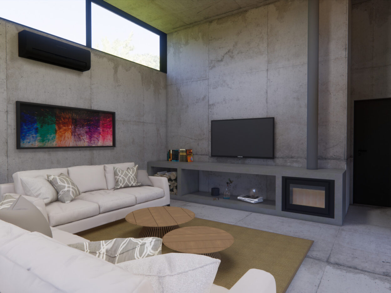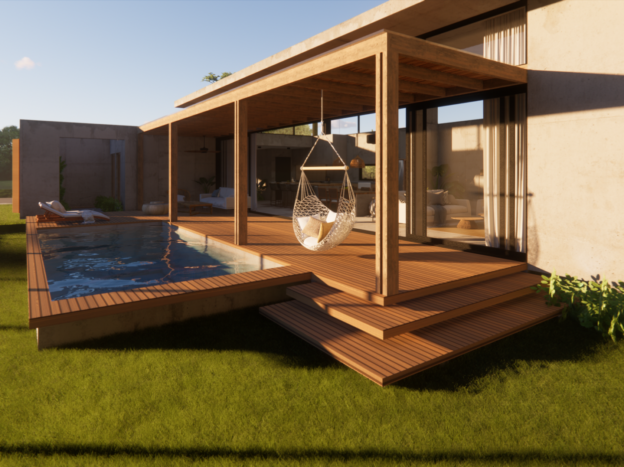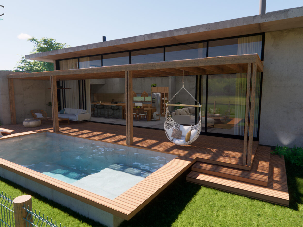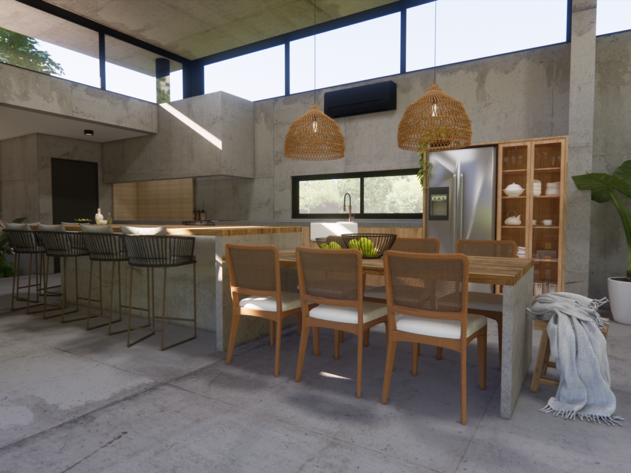 Projeto de uma residência térrea de alto padrão em uma área exclusiva da cidade. A casa, projetada inteiramente em concreto, é organizada em torno de um espaço externo central, o “coração da casa”. Esta área externa não só conecta os diferentes espaços internos, mas também proporciona uma atmosfera de relaxamento e convívio ao ar livre. Design moderno e elegante, aliado à durabilidade do concreto.
